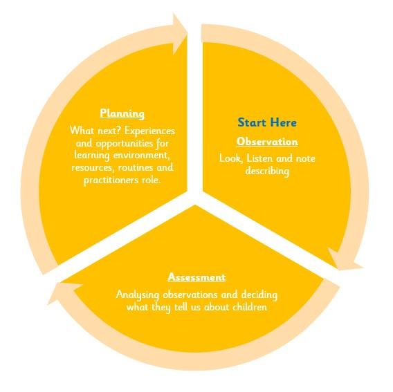 By using this cycle on a moment-by-moment basis, the adult will be always alert to individual children (observation), always thinking about what it tells us about the child’s thinking (Assessment) and always ready with appropriate strategies at the right moment to support children’s wellbeing and learning (Planning for the next moment).